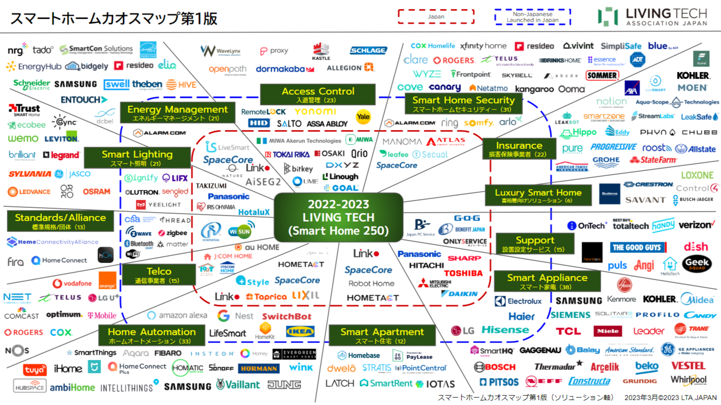 本カオスマップに関しては、当協会が2023年3月16日に開催した「LIVING TECH Week 2022-2023」のDAY-1セッションにおいて細かな解説を実施しております。世界最大の家電見本市と言われる「CES」の2023年におけるスマートホームトレンドや、注目のグローバル規格「matter」に関する解説に加え、スマートホームに関するグローバルコンシューマーサーベイの報告や、LIVING TECHトレンドを含め、以下公式Youtubeチャンネルよりアーカイブとしてご覧いただけます。
